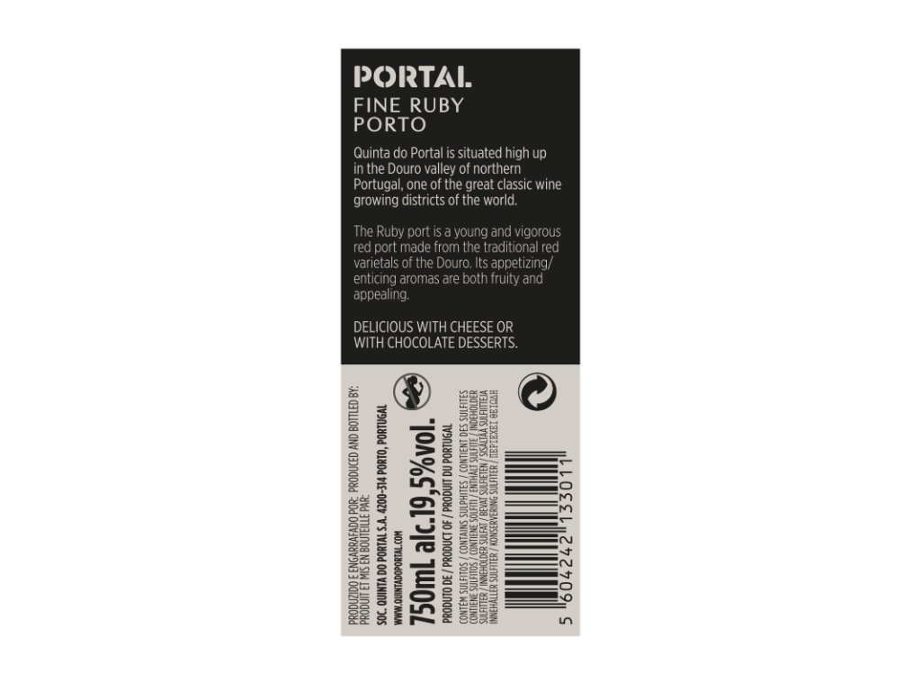 RUBY Ruby je portské víno, které se vyrábí z modrých hroznů. Zraje většinou cca 3 roky v obrovských dubových sudech (případně v ocelových tancích), kde má jen malý kontakt se dřevem a vzduchem a uchová si proto svoji výraznou ovocnou chuť, vůni i barvu. Portské ruby by mělo chutnat jako lesní ovoce, maliny, borůvky a jahody, vonět jako zralé višně a mít výrazně rubínovou barvu. Je spíše vhodné ke konzumaci nyní než k archivaci. Je výborné jako dezertní víno k černé čokoládě, čokoládovým dortům nebo lehkým sýrům.